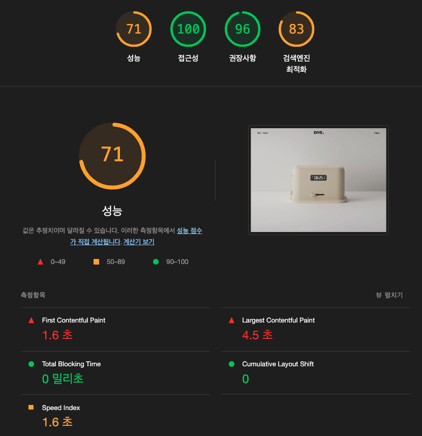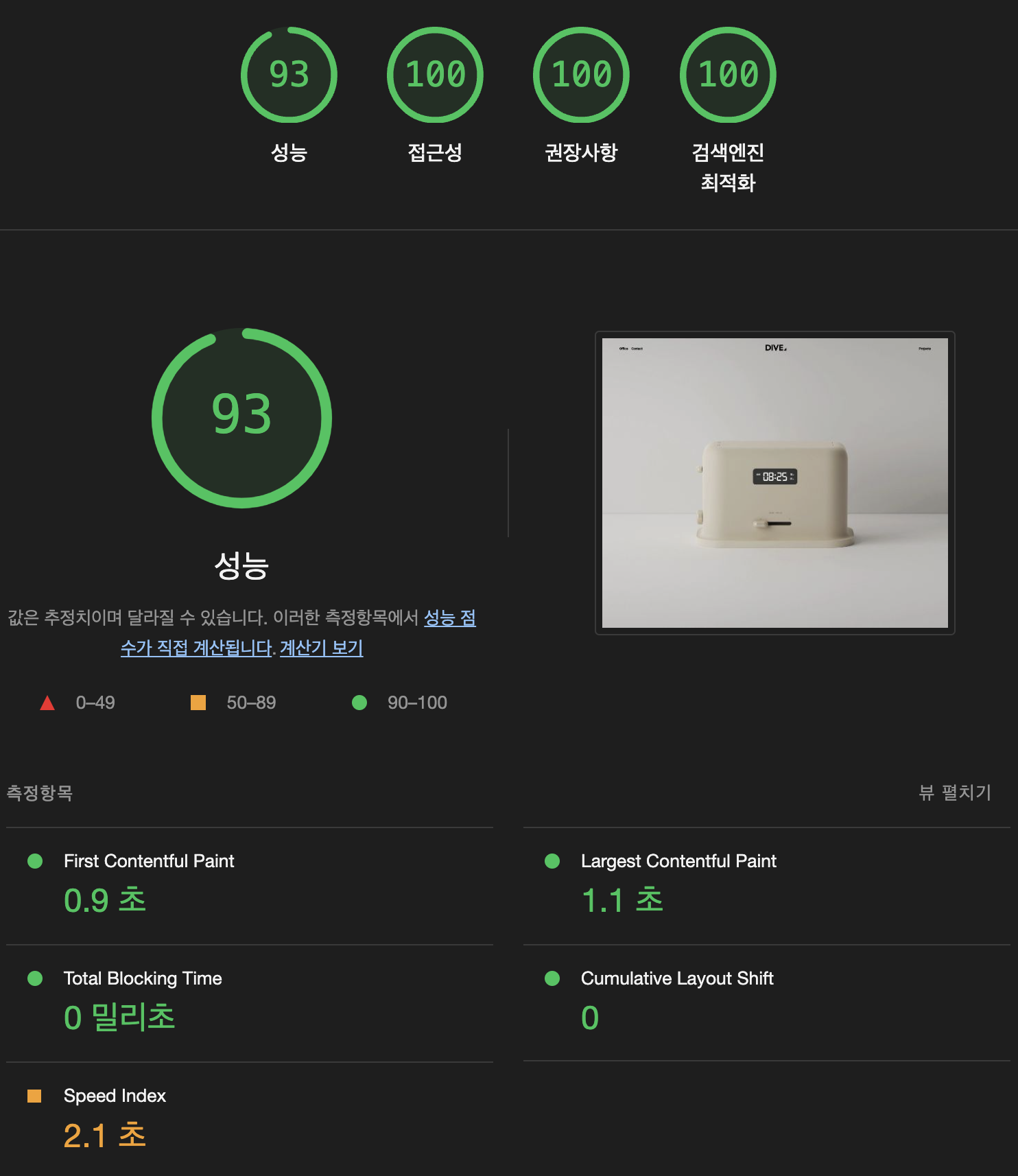 해당 작업으로 검색엔진 최적화를 진행하고 Lighthouse 검사를 다시 진행했다.